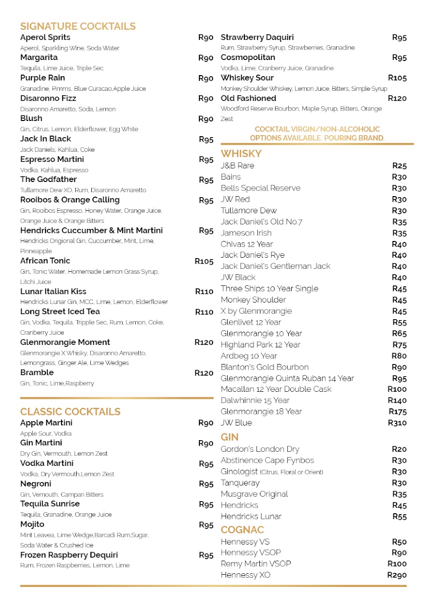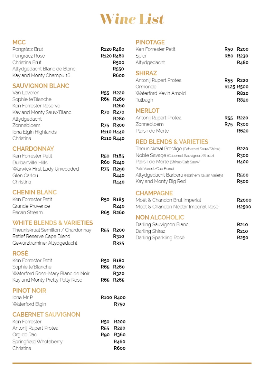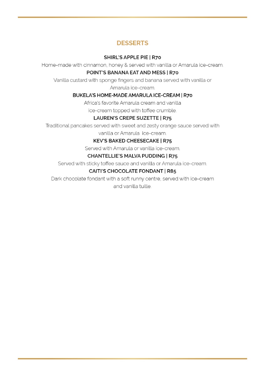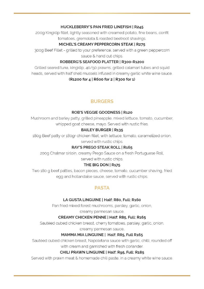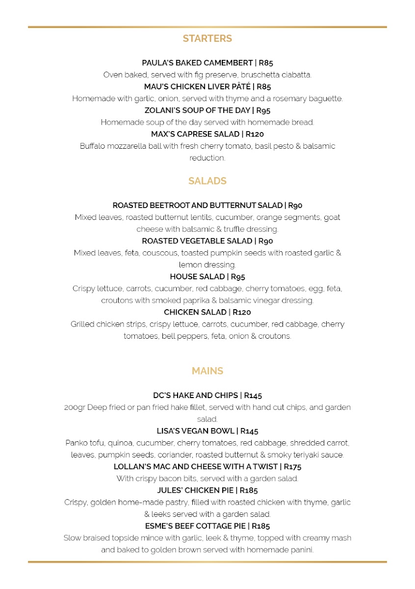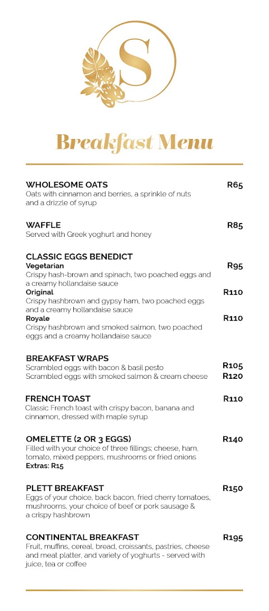 The menu at The Sanctuary Restaurant in Plettenberg Bay offers a delightful mix of flavors, catering to a variety of tastes. For breakfast, guests can choose from wholesome options like Wholesome Oats or the indulgent Waffle. For a classic touch, Classic Eggs Benedict or French Toast are also available, providing a satisfying start to the day. If you're in the mood for something savory, the Breakfast Wraps are a hearty option. Moving to the starters, Paula’s Baked Camembert and Mau’s Chicken Liver Pâté offer rich, flavorful beginnings, while Max’s Caprese Salad provides a fresh, lighter choice. The restaurant also serves comforting salads such as the Roasted Beetroot and Butternut Salad and House Salad, perfect for a healthy yet satisfying meal. For mains, diners can enjoy dishes like DC’s Hake and Chips, Jules’ Chicken Pie, or Esme’s Beef Cottage Pie, all with their own unique twists. Vegetarians can savor the Lisa’s Vegan Bowl, while cheese lovers will appreciate the Lollan’s Mac and Cheese with a Twist. The burger section includes the vibrant Rob’s Veggie Goodness and the bold Bailey Burger. Ray’s Prego Steak Roll and the hearty Big Don offer a satisfying meat option. Pastas like La Gusta Linguine and Chili Prawn Linguine are flavorful, and Mamma Mia Linguine is perfect for pasta lovers. To end the meal, dessert choices such as Shirl’s Apple Pie, Lauren’s Crepe Suzette, and Kev’s Baked Cheesecake offer a sweet finish, while Bukela’s Home-made Amarula Ice-Cream is a unique treat for those looking for something indulgent. This diverse menu at The Sanctuary truly delivers a fantastic culinary experience, with options for every palate and preference.